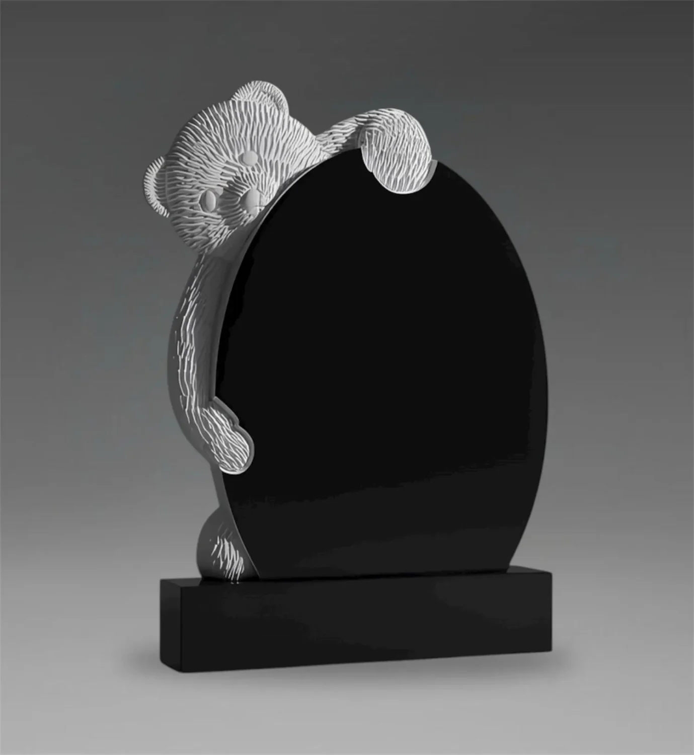 ✔ Rzeźbiony miś przy owalnej płycie – symbol dzieciństwa, czułości i troski.
