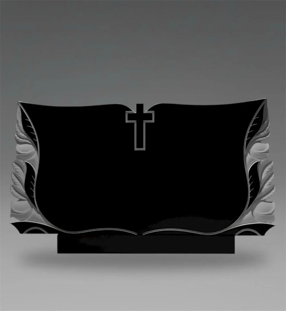 Tablica nagrobna granitowa z ozdobnym krzyżem i liśćmi – symbol duchowej pamięci i pokoju
