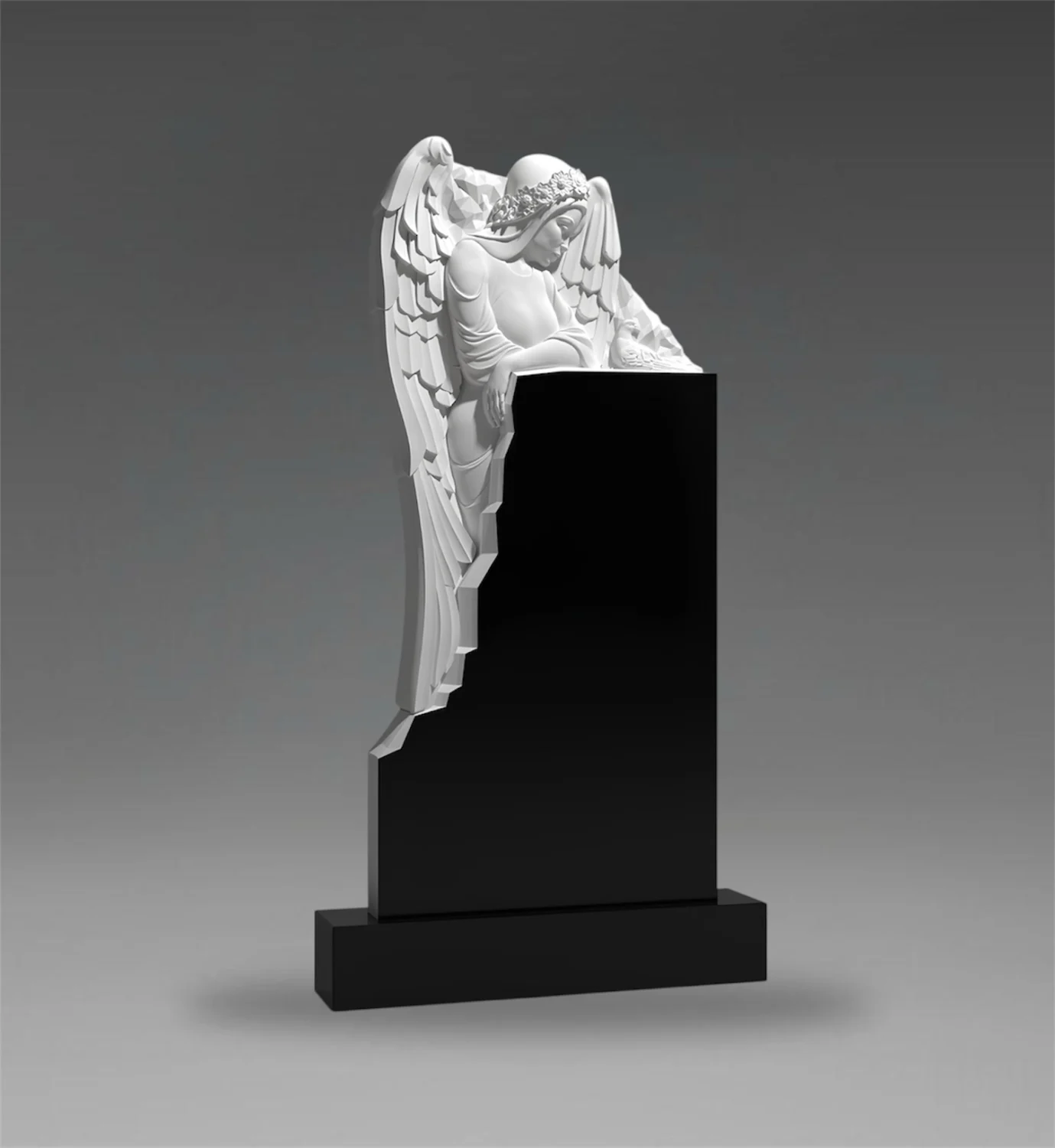 Anioł, wyrzeźbiony z niezwykłą dokładnością, nadaje tablicy nagrobnej wyjątkowy charakter. Każdy detal, od skrzydeł po wyraz twarzy, został wykonany z dbałością o szczegóły, podkreślając indywidualność pomnika.