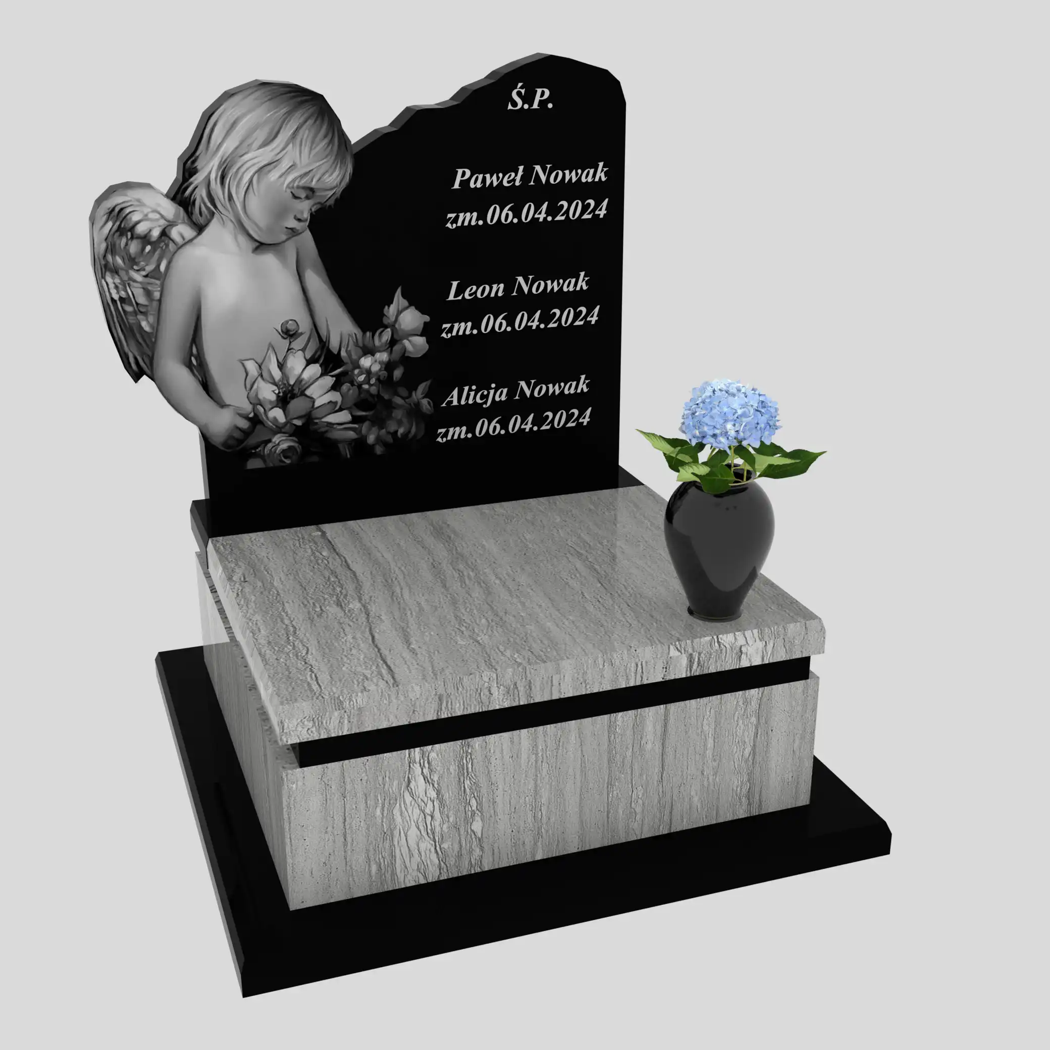 Najważniejszym elementem jest tablica pionowa o miękkiej, falującej linii w górnej części. Na czarnym tle wykonano duży, bardzo emocjonalny grawer: anioł w zadumie, z opuszczoną głową, oraz delikatne kwiaty – motyw, który niesie spokój i symbolizuje niewinność. To jest nagrobek dziecięcy z aniołem, który wygląda jak cicha modlitwa w kamieniu.