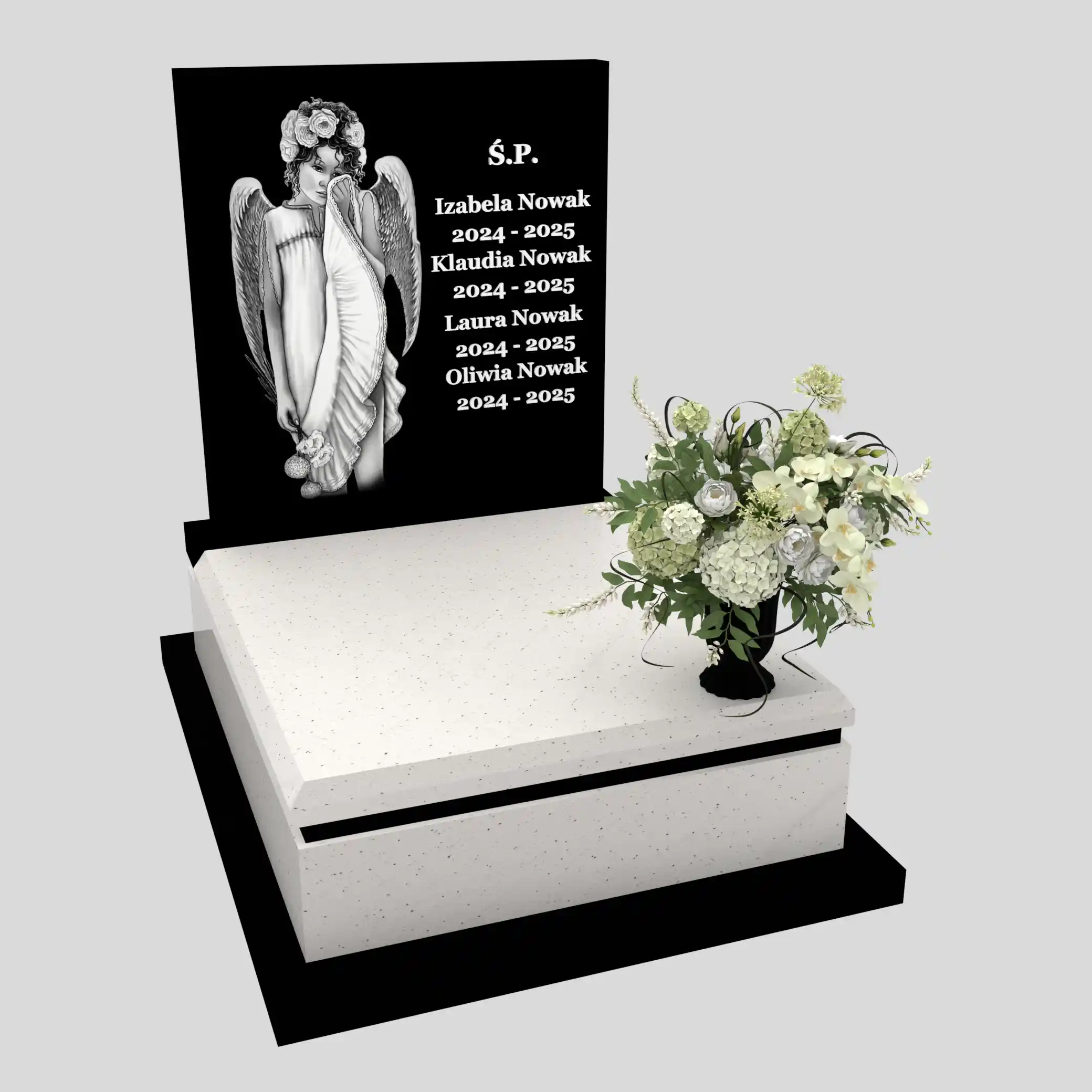 W projektach takich jak nagrobek dla dziecka jasny granit jest wybierany bardzo często, bo kojarzy się z czystością, światłem i niewinnością. Super White w połączeniu z czarną tablicą tworzy klasykę, która jest ponadczasowa: nie podlega modzie i po latach nadal wygląda elegancko. Dzięki temu nagrobek dziecięcy D 76 zachowuje charakter premium, ale bez przesady – to projekt, w którym najważniejsze jest znaczenie i godność.