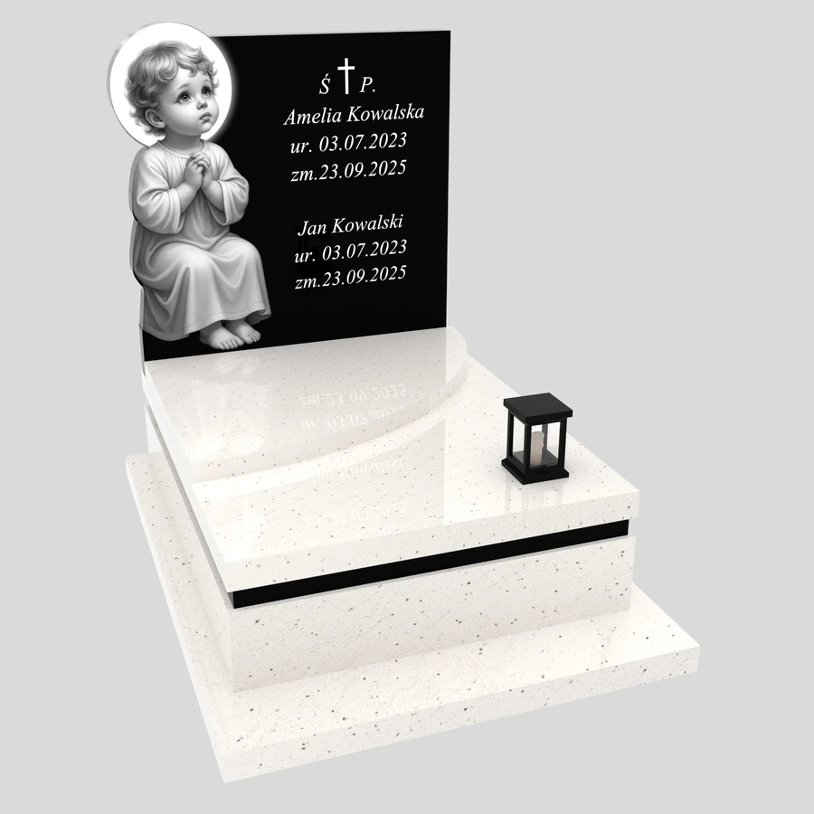 Nagrobek dziecięcy D 78 powstał z myślą o tym, co w takich chwilach najważniejsze: o ciszy, godności i delikatności, która nie rani serca, a pozwala spokojnie zapalić znicz i pomodlić się za dziecko. Strata dziecka jest dla rodziców doświadczeniem, którego nie da się opisać słowami – dlatego nagrobek dla dziecka nie może wyglądać „jak kolejny projekt”. Musi być subtelny, prawdziwy i wykonany z ogromnym wyczuciem. Właśnie taki jest model D 78: czysta, jasna bryła z granitu w stylu Super White, elegancko zestawiona z czarną, polerowaną tablicą, na której znajduje się wyraźny, poruszający grawer anioła – aniołka w modlitwie.