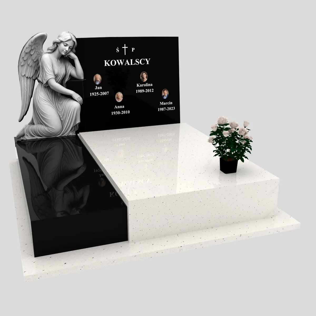 Nowoczesność w tym przypadku polega na świadomym wyborze formy – bez nadmiaru zdobień, ale z mocnym akcentem artystycznym w postaci anioła. Dzięki temu nagrobek podwójny CK 114 zachowuje klasę nawet po wielu latach.