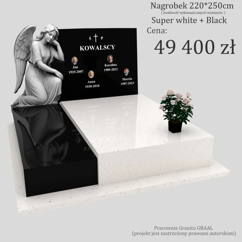 Ten projekt bez wątpienia wpisuje się w kategorię nagrobki artystyczne oraz eleganckie pomniki podwójne nowoczesne. Anioł symbolizuje opiekę, ciszę, nadzieję i przejście do życia wiecznego, co czyni ten nagrobek szczególnie odpowiednim dla rodzin ceniących duchowy wymiar upamiętnienia.