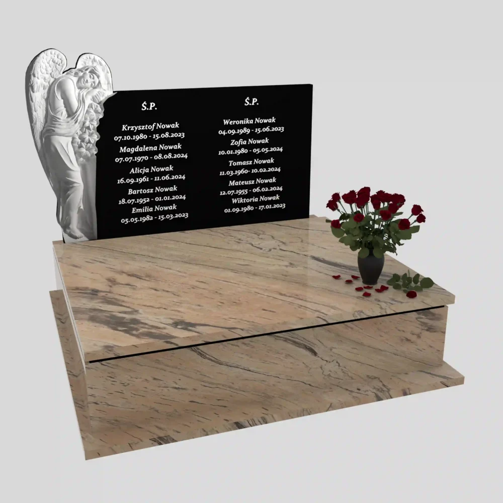 W tej kompozycji anioł pełni rolę symbolicznej „obecności” – jest znakiem opieki, ukojenia i nadziei. To motyw szczególnie wybierany dla nagrobków rodzinnych, gdy chce się podkreślić ciepło, bliskość i pamięć, a jednocześnie zachować klasę i umiar.