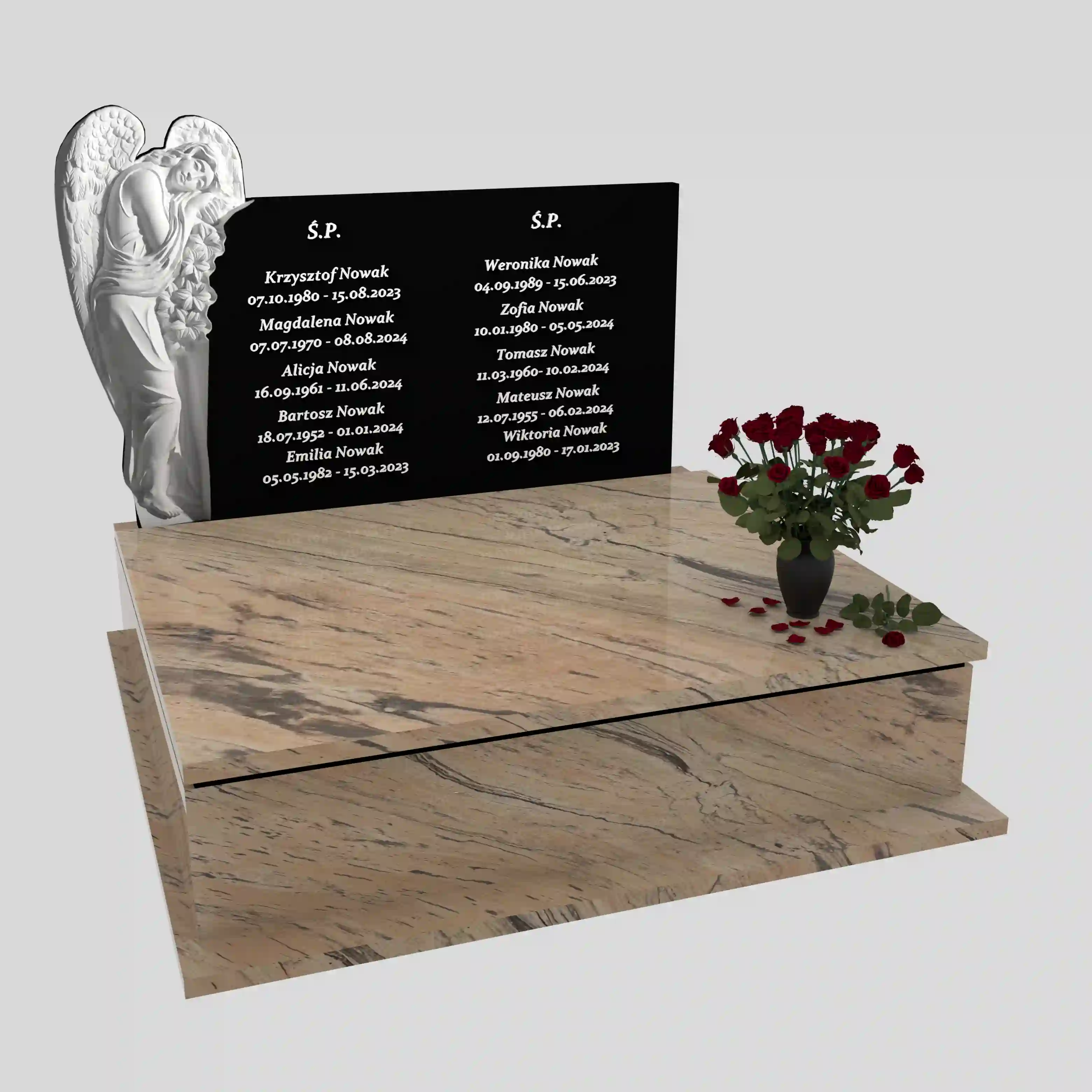 Nagrobek podwójny CK 112 to projekt dla rodzin, które szukają spokojnej elegancji, dużej czytelności i prawdziwie reprezentacyjnej formy. Na zdjęciu widać szeroką, masywną podstawę oraz dwie strefy użytkowe, typowe dla układu „podwójnego” – dzięki temu całość wygląda harmonijnie i jest wygodna w codziennej pielęgnacji. Dominującym elementem jest pionowa tablica z nazwiskami oraz grawerowany anioł po lewej stronie – wyraźny, jasny akcent na tle czarnego granitu, który natychmiast nadaje pomnikowi głębię i duchowy charakter.