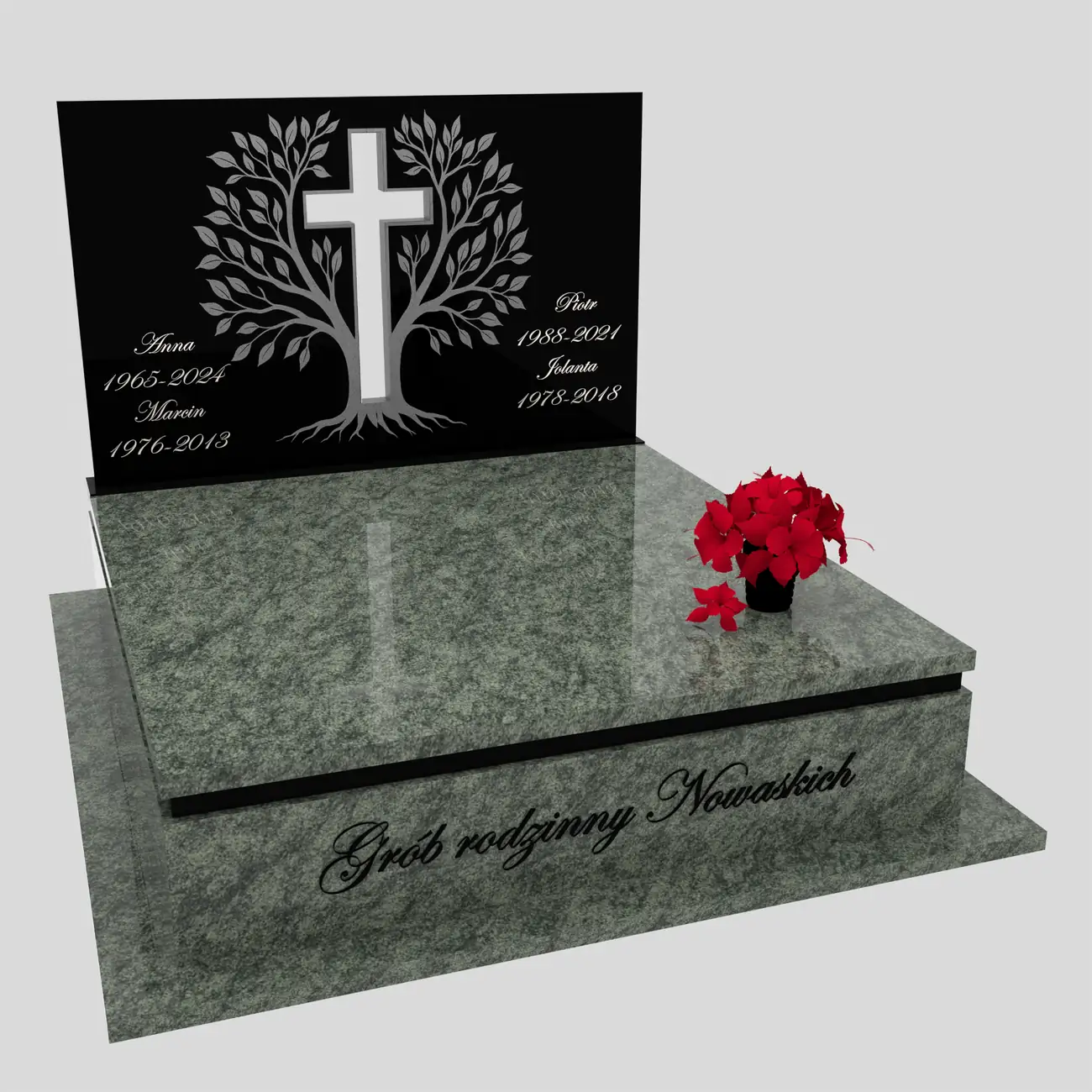 Nagrobek podwójny z grawerowanym drzewem i rzeźbą krzyża CK 104 to wyjątkowy projekt łączący głęboką symbolikę chrześcijańską z motywem drzewa życia. Jest to pomnik przeznaczony dla rodzin, które chcą podkreślić wspólnotę, pamięć pokoleń oraz trwałe wartości, jakie łączą bliskich nawet po śmierci.