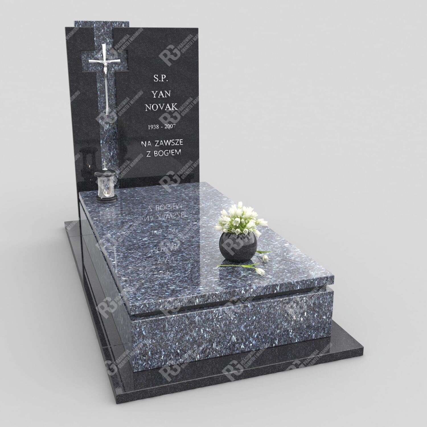 - Nagrobek został wykonany z granitu Blue Pearl, który charakteryzuje się niepowtarzalnym, niebiesko-szarym odcieniem z delikatnym połyskiem. Ten rodzaj granitu jest ceniony za swoją wyjątkową trwałość oraz estetykę, która dodaje nagrobkowi elegancji i prestiżu.