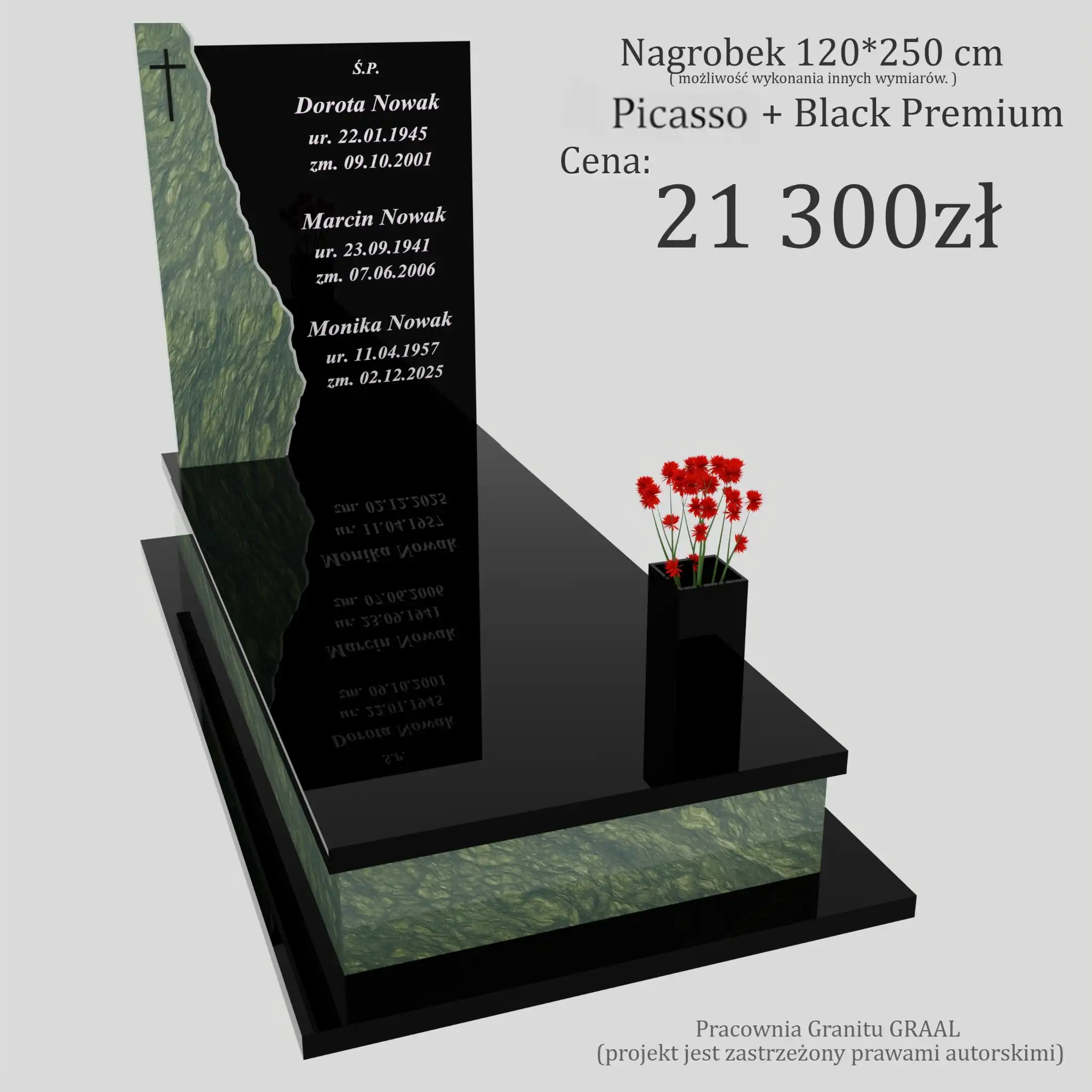 Każdy klient otrzymuje u nas bezpłatną wizualizację 3D pomnika, dzięki której można dokładnie zobaczyć projekt przed rozpoczęciem realizacji.