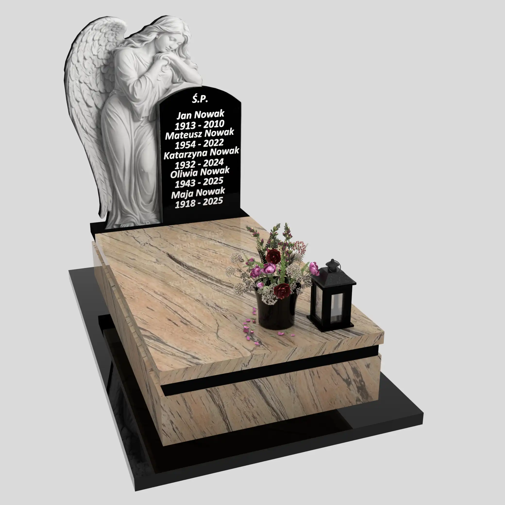 Wybierając nagrobki z rzeźbą anioła, klienci zwykle szukają czegoś bardzo osobistego: znaku opieki i nadziei. W tym modelu anioł jest subtelny, ale wyrazisty: skrzydła mają wyraźną strukturę, a sylwetka jest dopracowana tak, by całość wyglądała naturalnie i godnie. To pomnik, który mówi spokojem – bez przesady, bez „krzyku” formy.